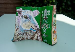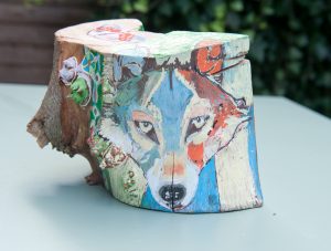 In het Noorderplantsoen lagen boomstammen. Ik zag deze mooie stam en sleepte hem mee naar huis. Na wat zaagwerk kreeg ik het stuk hout dat ik beschilderd heb.